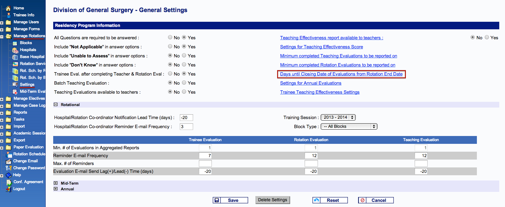 This setting is accessed by selecting “Manage Rotations“, “Settings“, and then “Days until Closing Date of Evaluations from Rotation End Date“.