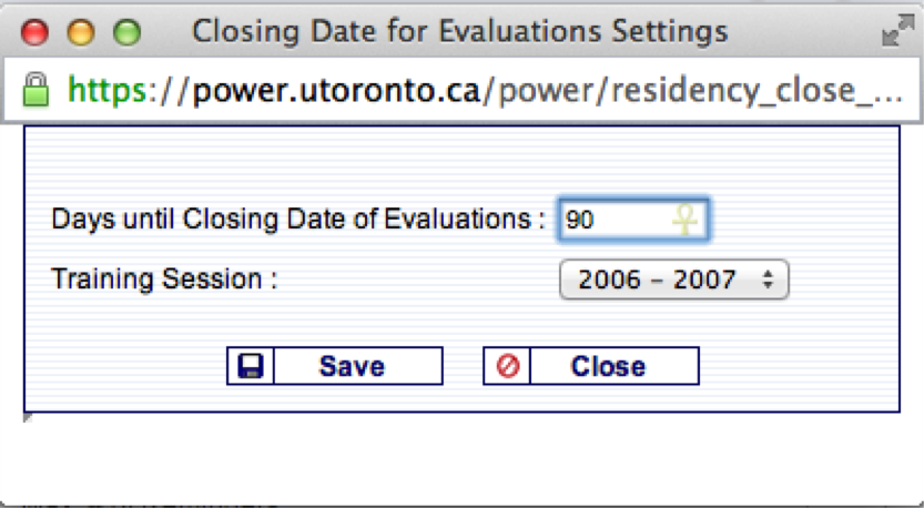 In the example shown below for training session 2006-2007, teachers and learners are given 90 days from the rotation end date to complete their evaluations. For example, If a rotation ended on 30-Jun-07 the evaluations would be considered “closed” from 29-Sep-07 onwards.