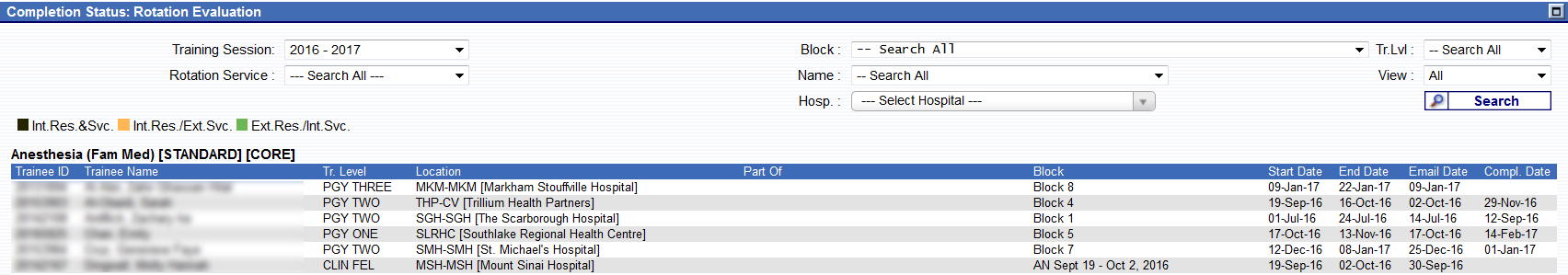 Complete Status: Rotation Evaluations menu item displays the status of rotation evaluations that were assigned to Learners in order to evaluate their completed rotations. The screen basically gives you an idea of the completed status of your rotation evaluations.