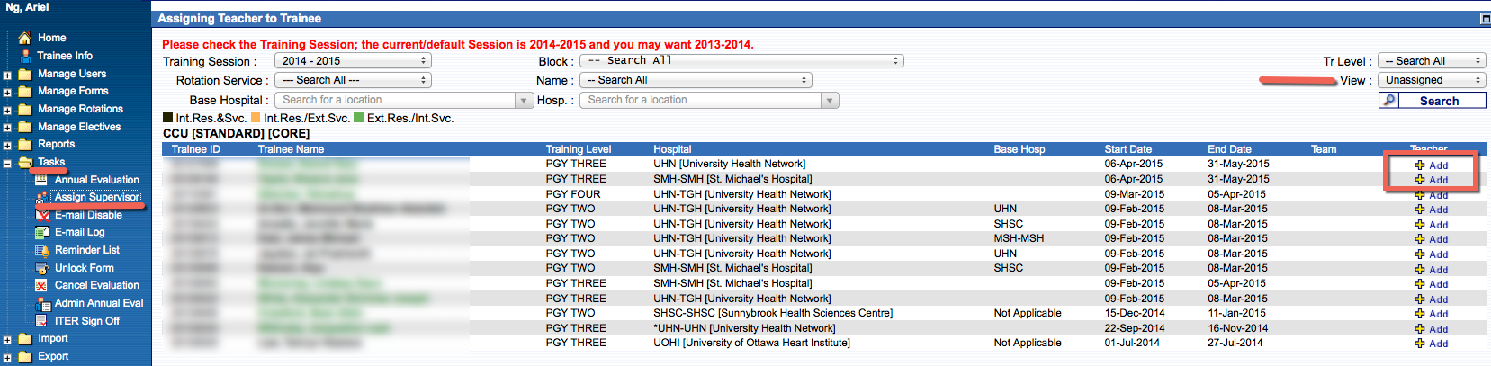 Once Administrators enter Learners’ rotations via the Trainee Info screen the rotation information appears in the Assigning Teacher to Trainee screen, provided evaluations are required for the rotations. The default screen is the “unassigned” rotations.