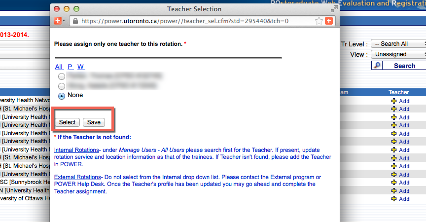 Note that Teachers appear on the list only if they have Teacher roles in POWER and they have, in their profile, the same rotation and location information as that of the Learner’s rotation information. Teachers missing on the list either are not in POWER or simply require their profiles to be updated with to match the Learner’s rotation information. Sometimes however the Learner’s rotation information needs to be updated to reflect the Teacher’s profile information. Ensure the Learner’s rotation information is correct before updating Teacher’s profiles.