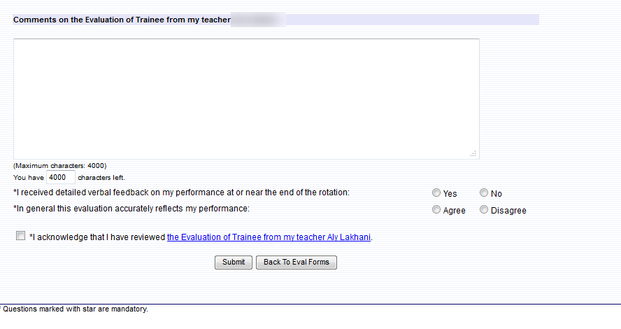 5. If the ITER/ITAR is completed by the assigned teacher, the trainee is able to view the evaluation, add any comments, agree or disagree with the evaluation, acknowledge that he/she has reviewed the evaluation, and submit the form.