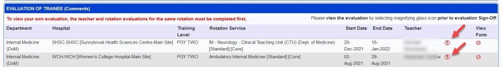 For trainee evaluations that have not been completed by the assigned teacher or have not been assigned at all, a red circle with an exclamation mark appears to the right of the rotation information, as shown below. Hovering over the each symbol displays the definition.