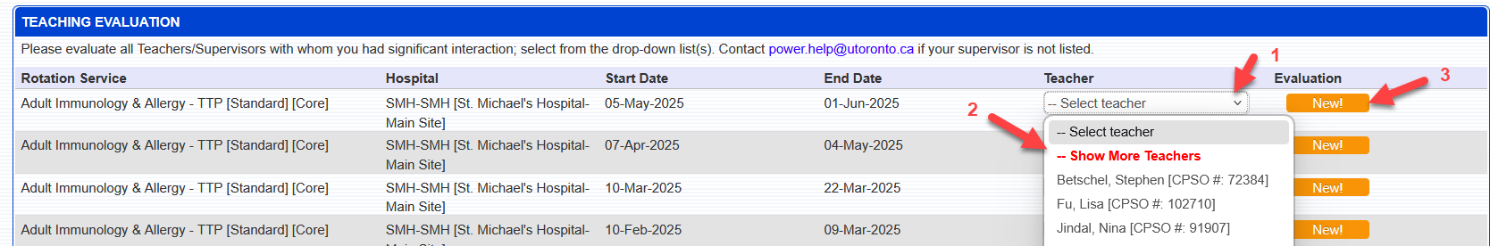 A drop down list of teachers may be provided from where the Trainee can select Teachers to evaluate. To evaluate teachers not found on the list, trainees can select ‘Show More Teachers’ option found on the list – this will display all teachers with an active Teacher account in the program in POWER. The Trainee selects one Teacher and then clicks ‘NEW!’ next to the evaluation form to begin the evaluation process. If a Teacher is not found on the list to evaluate then please contact your Program Administrator for assistance.