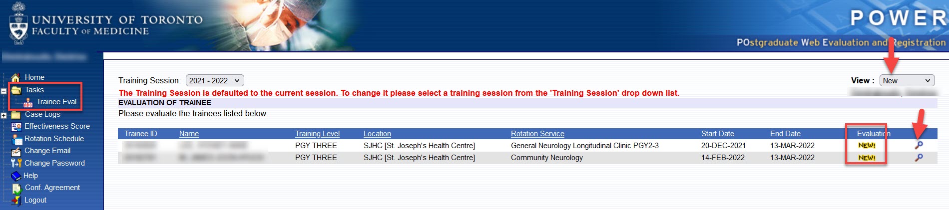 To access trainee evaluations, click Tasks, Trainee Eval from the menu. Ensure the Training Session is the correct one and the View filter lists New for outstanding evaluations.