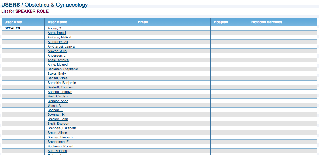 “Speakers” displays all speakers who have taught a session or will be conducting a future session. Speakers in the system can hold any role in your program except program director.