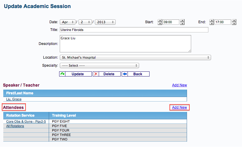 To add a speaker, click the “Add New” button in the speaker’s section. Clicking the drop down arrow next to “Select teacher from the list:” displays all the teachers listed in the residency program. Teacher names appear in black text while the existing speaker(‘s’) appear(s) in orange text. Once a teacher/speaker is selected from the list his/her name will appear with the details: email, role, and department. The speaker’s name will have to be entered manually if he/she is not associated with the program. Remember to click “Save” when you are finished.