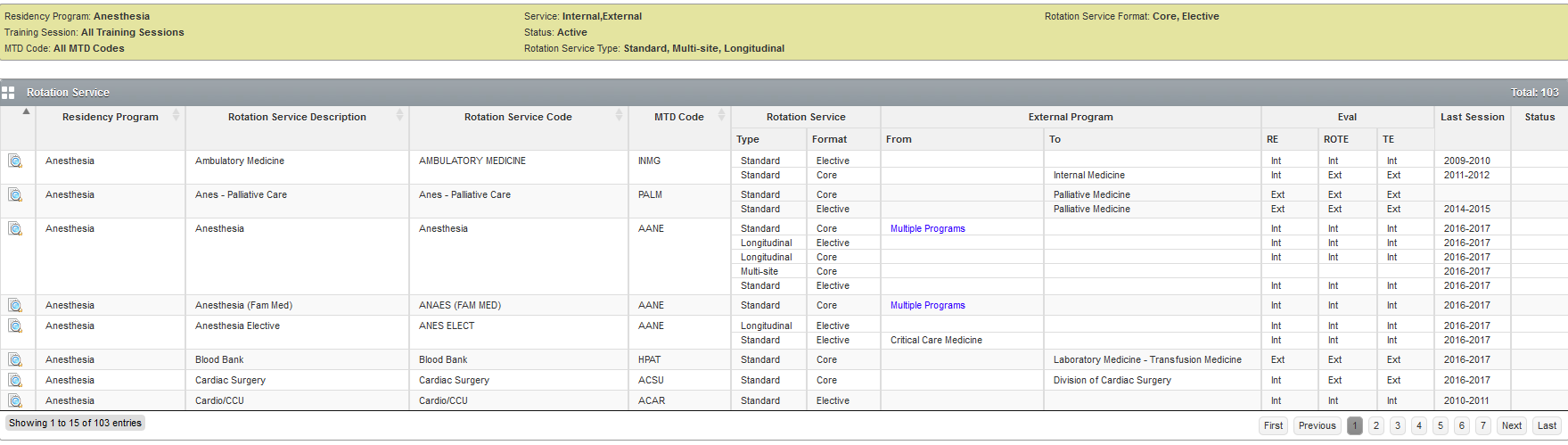 When a rotation service is linked out to another residency program it is considered to be an external rotation service. If there is a program listed under the ‘External Program – To’ column then the rotation service is considered to be external. From the above screen shot Blood Bank is external because it is linked to the Laboratory Medicine – Transfusion Medicine program.