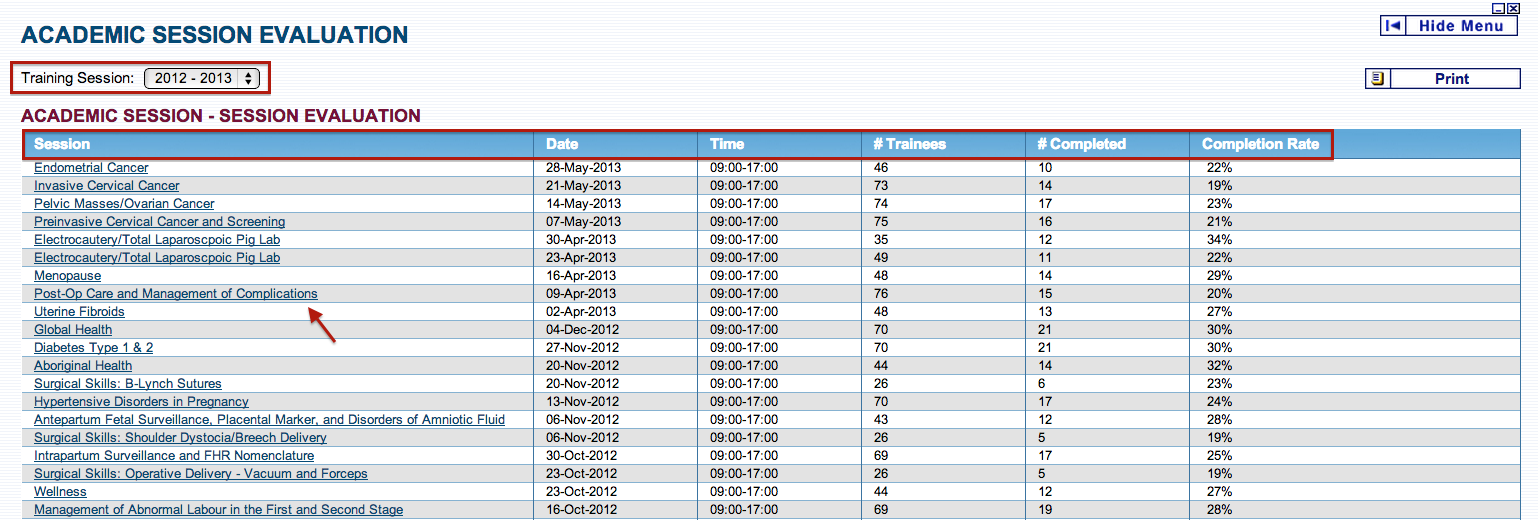 “Status'” displays the status of the academic sessions’ evaluations. The list contains the date and time of the session, the number of attendees (learners), number of evaluations completed, and percentage of evaluations completed. Where at least one evaluation has been completed, a link will be provided in the session name that will take you to the individual evaluations.