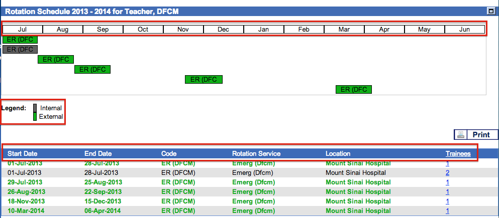 To relate the above with the Rotation Schedule in the previous screen, the 5 internal trainees shown above represent the 4 internal rotation services that are listed under the Rotation Schedule screen. The Rotation Schedule lists 4 internal rotation services because the last 2 trainees displayed above are scheduled during the same period and location and are therefore considered to be one rotation service for the teacher.