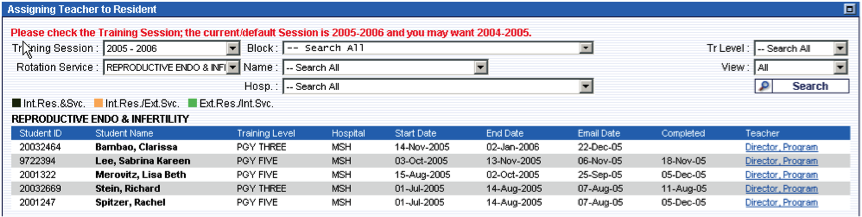 The screen below is a result of a search on the Reproductive Endo & Infertility (REI) rotation service. It lists the trainees and the teacher assigned to each trainee’s REI rotation.