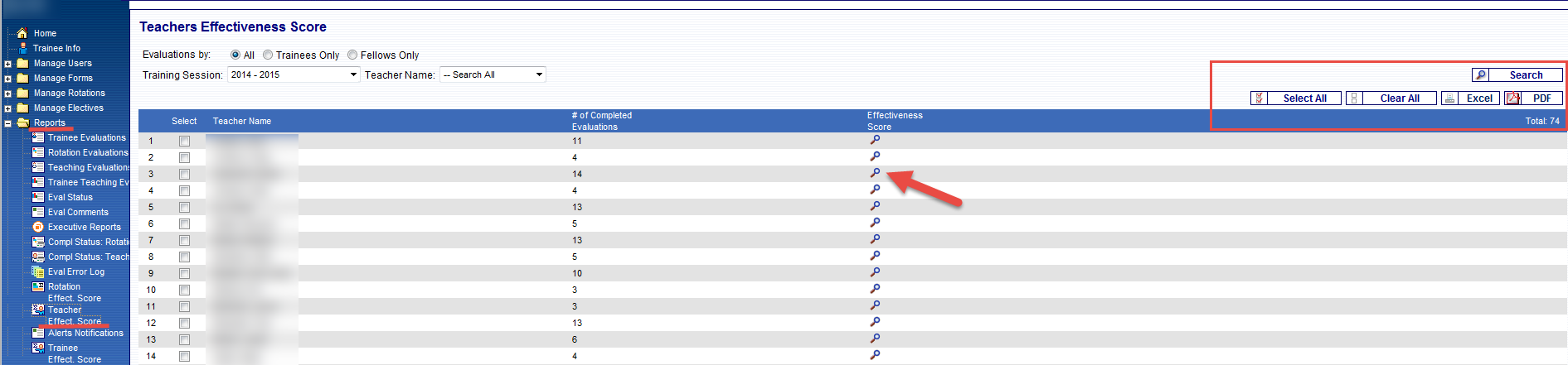 Once in the Teacher Effectiveness Score screen, you can view the TES reports of teachers by those completed by PGY learners only or by Fellows only. Select the learners you require next to the Evaluations by option.